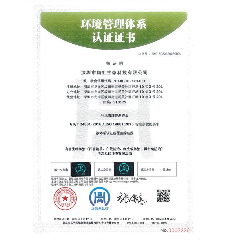深圳市翔虹生態科技有限公司成立于1995年,是深圳最早成立的專業蟲害防治公司之一。公司發展至今獲得全國有害生物防制服務A級資質、廣東省有害生物防制服務A級資質、深圳市有害生物防制服務A級資質、廣東省有害生物防制服務A級資質、深圳市有害生物防制服務甲級資質的單位,是中國有害生物防治協會會員、廣東省有害生物防治協會會員、深圳市有害生物防治協會理事單位,多次獲得“深圳市十佳消殺單位”榮譽。